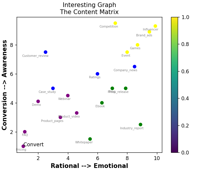 I am so excited to test my Python learning to create a content planning matrix. Guy Kawasaki's 2011 book Enchantment: The Art of Changing Hearts, Minds, and Action inspires me. With Python, I am able to dynamically structure the content matrix to help us think through two key dimensions, of which content type could support your marketing goals more cost-effectively.